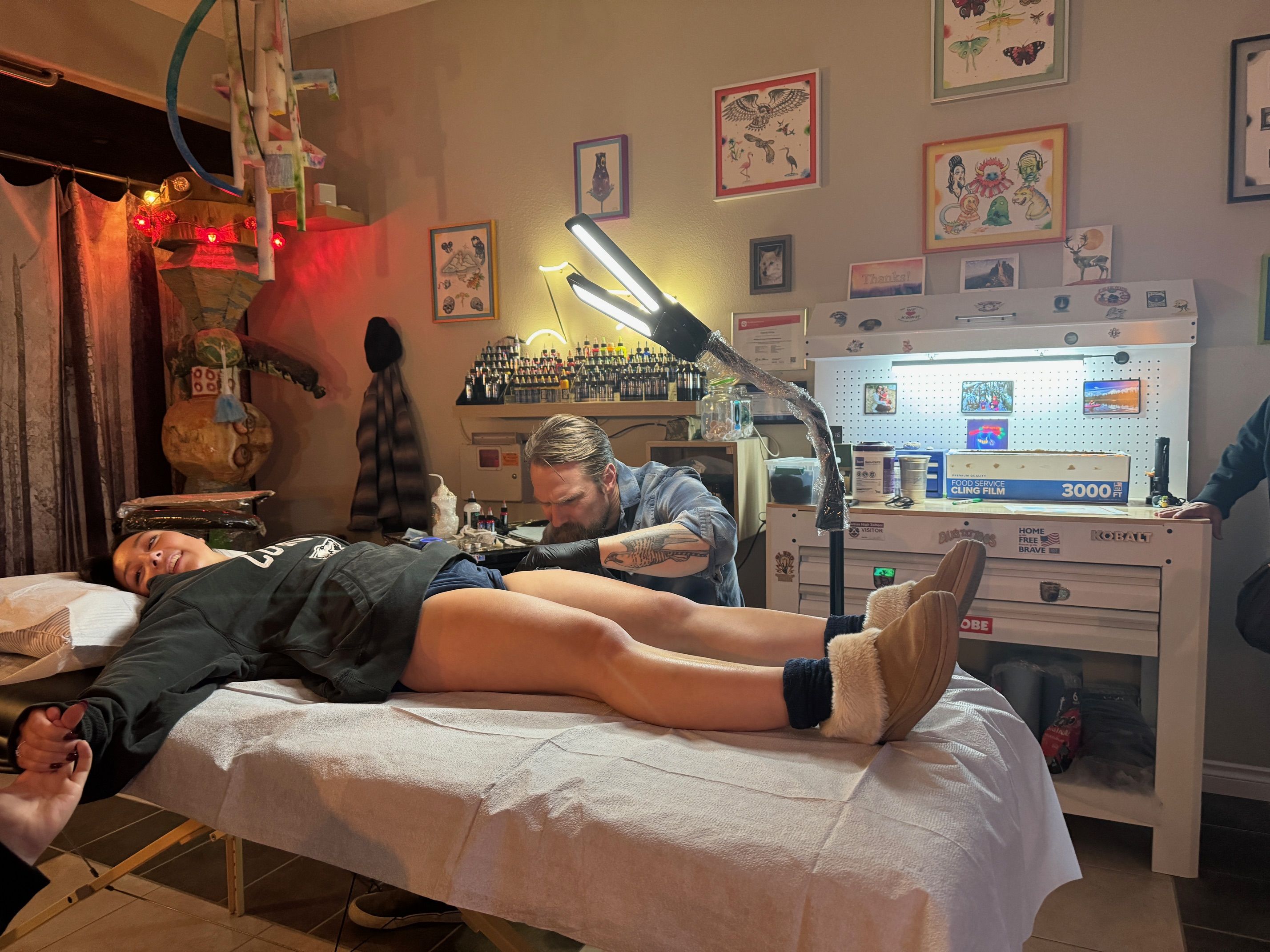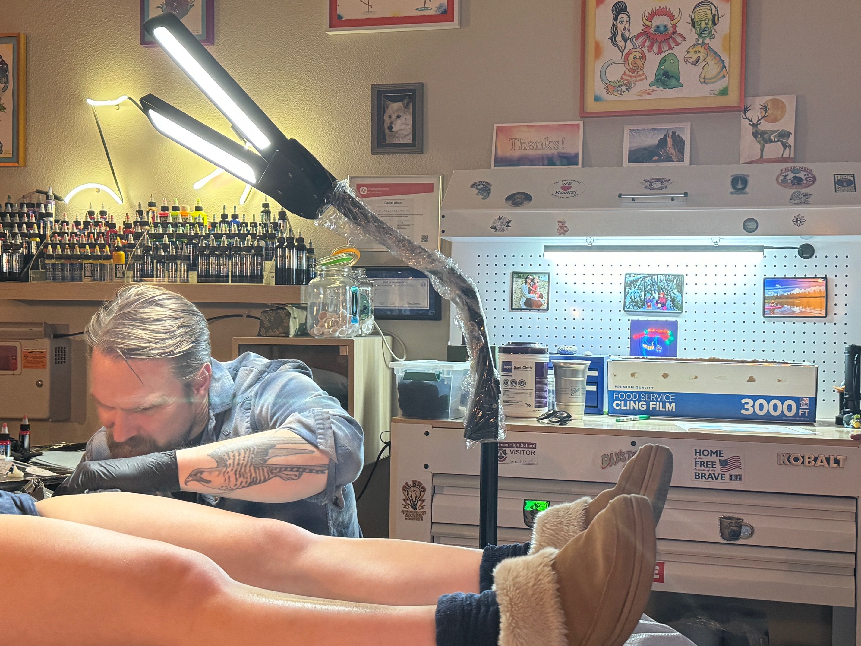 Dan’s Tattoos in Washougal, Washington is a tattoo shop owned and operated by internationally known artist and writer Dan Attoe. Located half an hour out of Portland, in the gateway to the beautiful Columbia gorge. There’s even a great view of the river from outside the shop. Choose from a selection of original flash or get a custom design.
